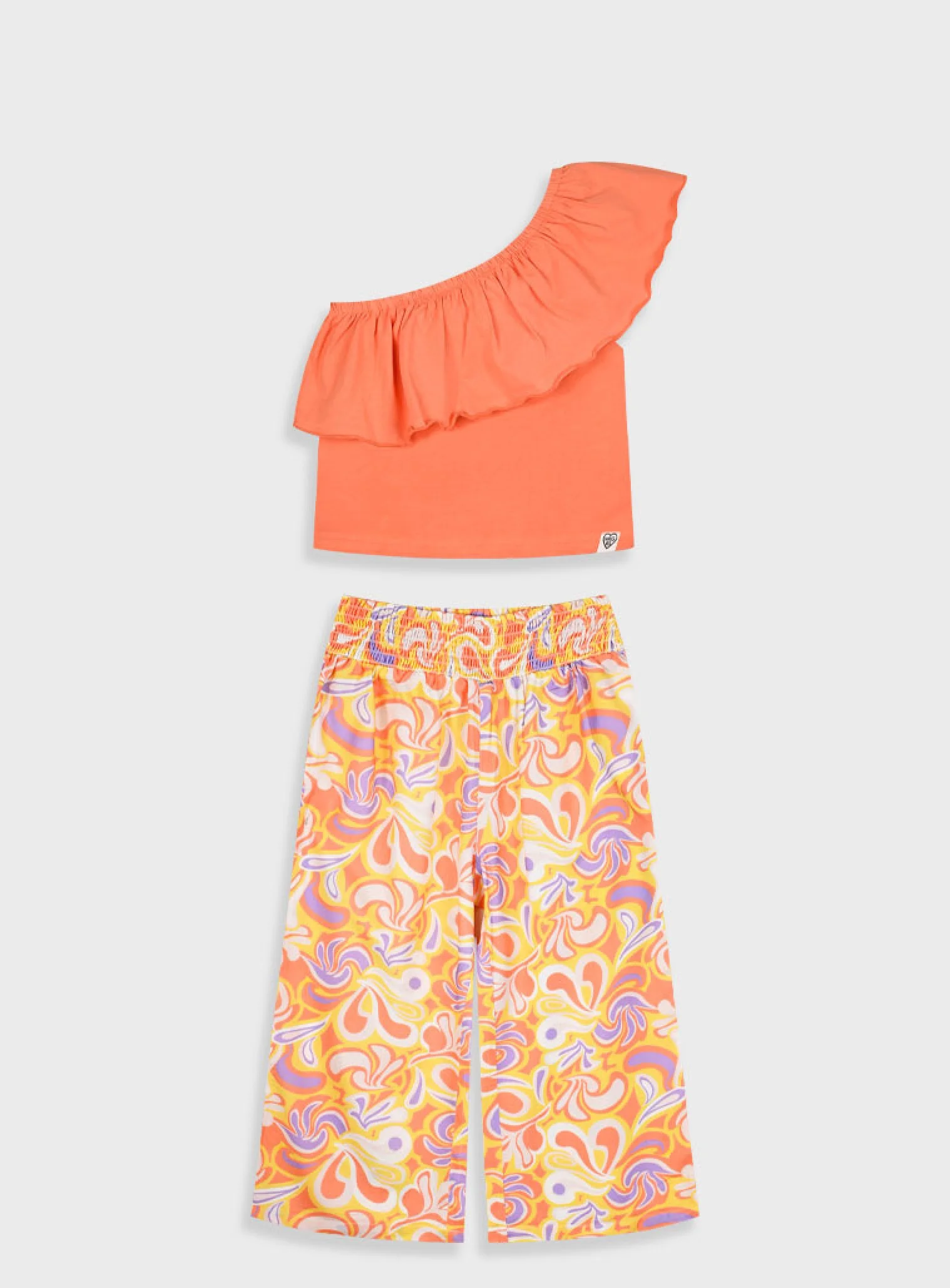 Σετ από μπλούζα με άνισους ώμους με φραμπαλά και επμριμέ παντελόνα με λάστιχο στην μέση για κορίτσι ΜΠΛΟΥΖΑ 95% ΒΑΜΒΑΚΙ -5% ΕΛΑΣΤΑΝ +ΠΑΝΤΕΛΟΝΑ 100% ΒΙΣΚΟΖΗ